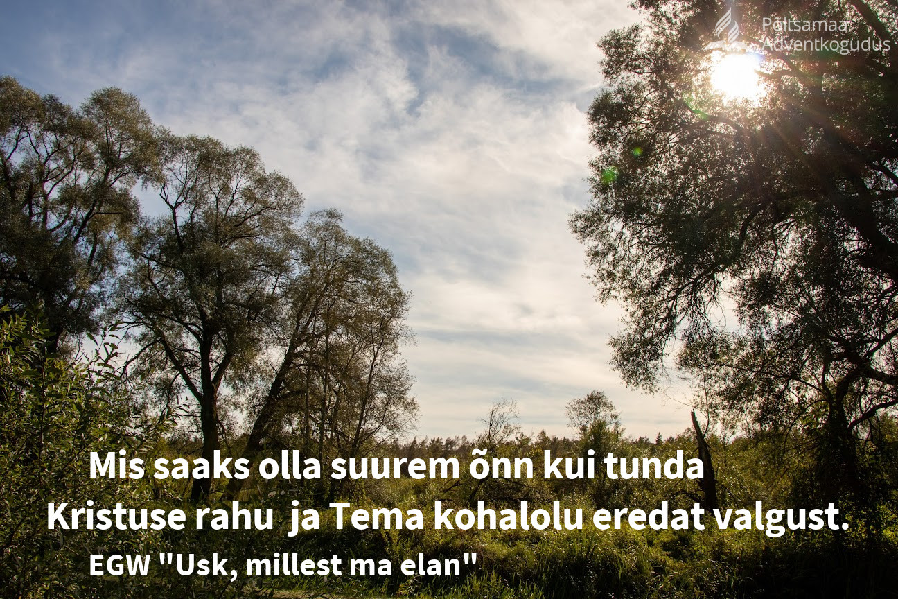 Mis saaks olla suurem õnn kui tunda Kristuse rahu ja Tema kohalolu eredat valgust. EGW “Usk, millest ma elan”