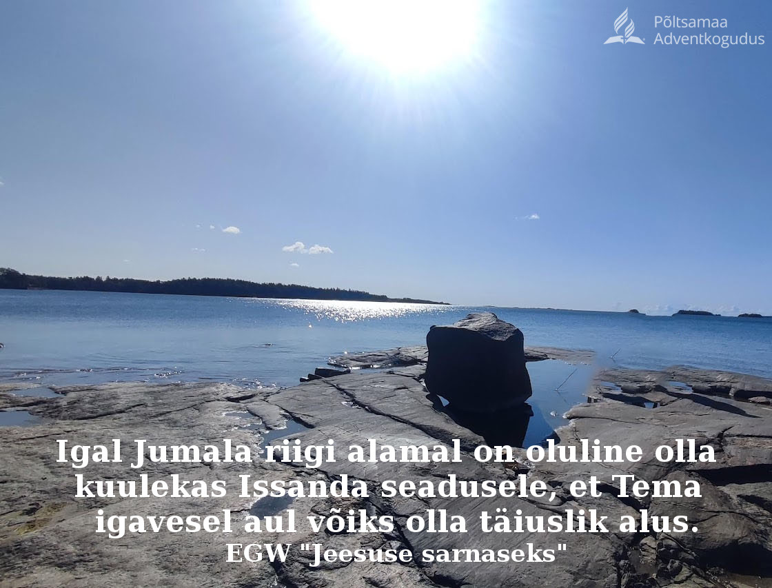 17. okt. 2025 Igal Jumala riigi alamal on oluline olla kuulekas Issanda seadusele, et Tema igavesel aul võiks olla täiuslik alus. EGW “Jeesuse sarnaseks” Share This Tweet Share Share Email Veel lugemist Selgitav mõttetera Kõik inimesed peavad oma hoone rajama igavesele Kaljule, Kristusele Jeesusele, siis jääb see tormi ja maru keskel seisma. EGW "Pilk ülespoole" Piiblisalm "Kitsas on värav ja ahtake on tee, mis viib ellu, ja pisut on neid, kes selle leiavad." (Mt 7:14) Elav usk Maa peal ei ole konfliktidest ja kiusatustest pääsu, kuid igas tormis on meil kindel varjupaik. Jeesus on öelnud: "See ongi võit, mis on võitnud ära maailma - meie usk." (1Jh…
