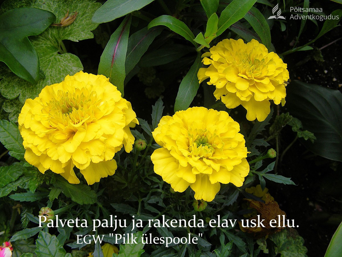 6. nov. 2025 Palveta palju ja rakenda elav usk ellu. EGW “Pilk ülespoole” Share This Tweet Share Share Email Veel lugemist Piiblisalm "Halleluuja! Kiitke Jumalat tema pühamus! Kiitke teda tema võimsas taevalaotuses! Kiitke teda tema vägevate tegude pärast! Kiitke teda tema määratut suurust mööda!" (Ps 150:1, 2) Kinnitav mõttetera Armus kasvav inimene sirutub üha enam taeva suunas, saavutades selge vaate evangeeliumi õnnistustele. EGW "Elu tänasel päeval" Tõene tsitaat Piiblist "Mina, Issand, uurin südant, katsun läbi neerud, et anda igaühele tema tee kohaselt, tema tegude vilja mööda." (Jr 17:10)