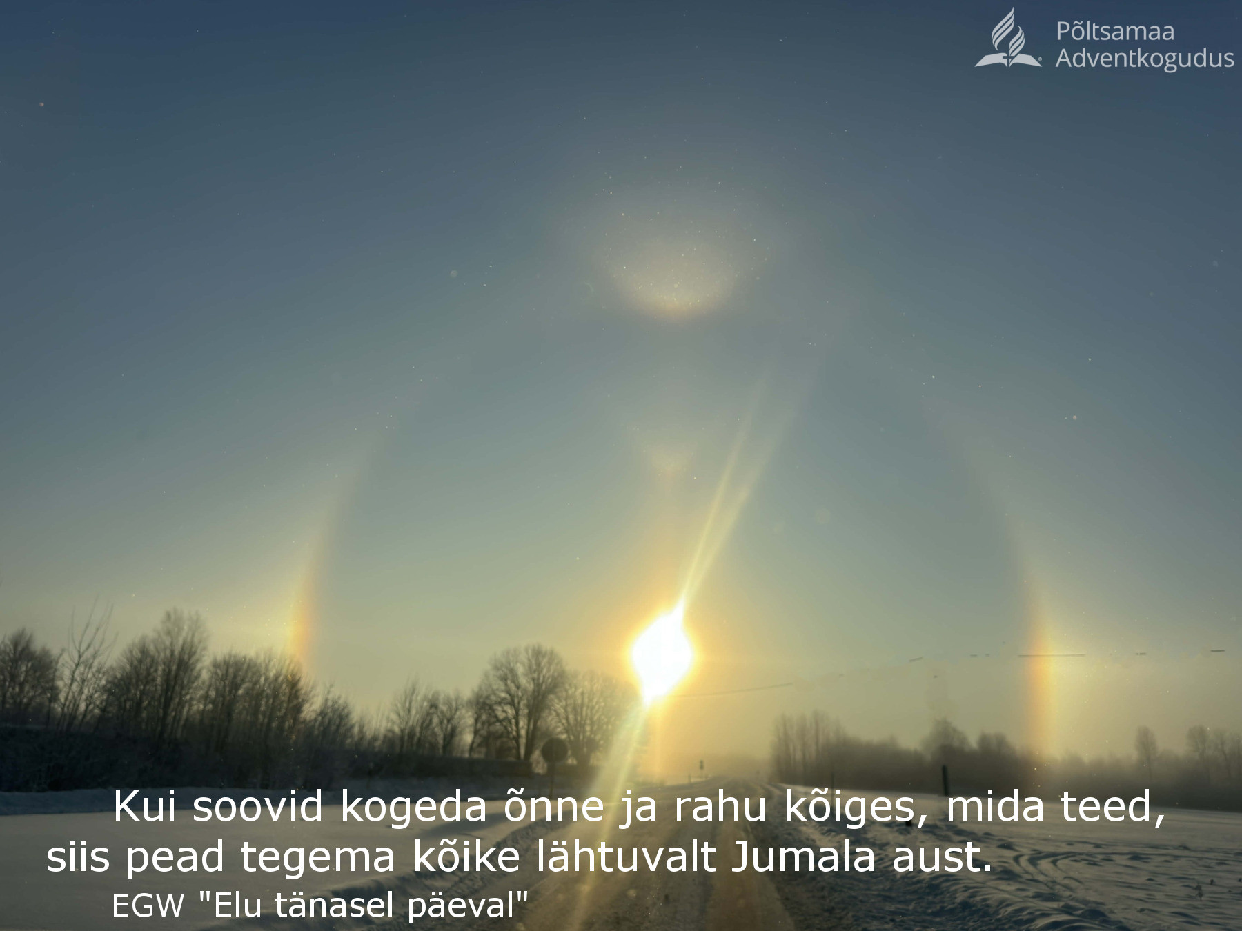12. märts 2026 Kui soovid kogeda õnne ja rahu kõiges, mida teed, siis pead tegema kõike lähtuvalt Jumala aust. EGW “Elu tänasel päeval” Share This Tweet Share Share Email Veel lugemist Piiblisalm "Üle kõige selle olgu armastus - see on täiuslik side!" (Kl 3:14) Vahvad tegevused lastele vanuses 6-13 Kutsume kõiki 6-13-aastaseid lapsi seiklema! Meie järgmine teemapäev toimub 14. märtsil kell 16 Põltsamaa Noortekeskuses, teemaks "Vapper abistaja". Õpime üheskoos esmaabi - kuidas märgata ja aidata abivajajaid ning ära tunda… Selgitav mõttetera Meie kohustus on elada kooskõlas antud valguse, omaduste ja andidega. EGW "Jeesuse sarnaseks"
