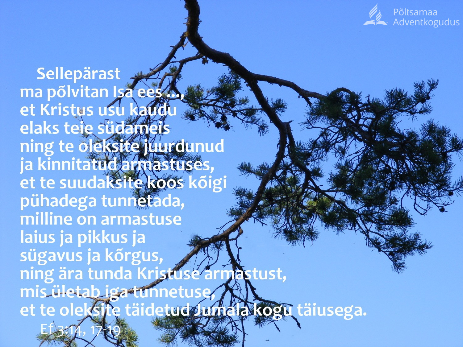 “Sellepärast ma põlvitan Isa ees …, et Kristus usu kaudu elaks teie südameis ning te oleksite juurdunud ja kinnitatud armastuses, et te suudaksite koos kõigi pühadega tunnetada, milline on armastuse laius ja pikkus ja sügavus ja kõrgus, ning ära tunda Kristuse armastust, mis ületab iga tunnetuse, et te oleksite täidetud Jumala kogu täiusega.” (Ef 3:14, 17-19)