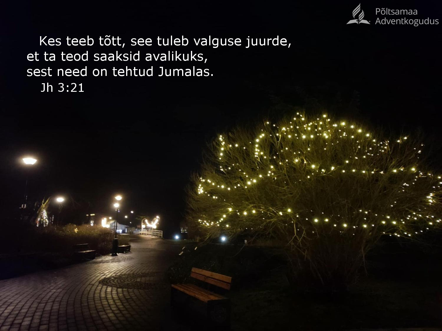 28. dets. 2025 “Kes teeb tõtt, see tuleb valguse juurde, et ta teod saaksid avalikuks, sest need on tehtud Jumalas.” (Jh 3:21) Share This Tweet Share Share Email Veel lugemist Hinnaline pärl Kristus ise on kallihinnaline pärl. Kristuse õigus on puhta, valge pärli kombel veatu ja plekitu. Jumala suurt ja kallist andi ei saa inimese mingisugune tegu enam paremaks muuta. See on… Head mõtted Püsige Kristuse rahus. EGW "Elu tänasel päeval" Piiblisalm "Olgu meiega arm, halastus, rahu Jumalalt Isalt ja Jeesuselt Kristuselt, Isa Pojalt, tões ja armastuses!" (2Jh 1:3)